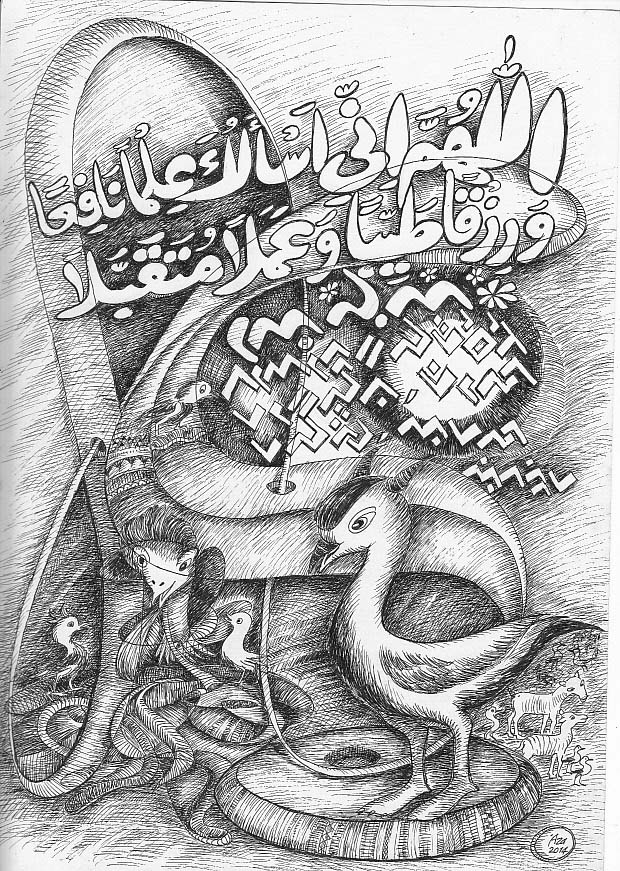 Kaligrafi Islam di atas berisikan doa yang sebaiknya dibaca setiap hari. Terjemahnya sebagai berikut: “Ya Allah berikan kepadaku ilmu yang manfaat, rezki yang halal dan amal yang dikabulkan.”