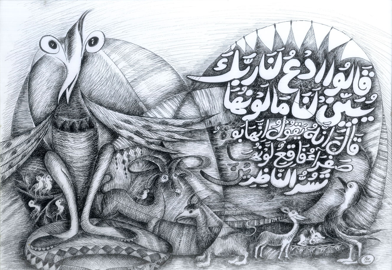 Kaligarafi Islam di atas diambil dari Kitab Suci al quran Surah Al-Baqarah: 69. Terjemahannya sebagai berikut: Mereka berkata “Mohonkanlah kepada Tuhanmu untuk kami agar Dia menerangkan kepada kami apa warnanya”. Musa menjawab: “Sesungguhnya Allah berfirman bahwa sapi betina itu adalah sapi betina yang kuning, yang kuning tua warnanya, lagi menyenangkan orang-orang yang memandangnya”. Kisah dalam alquran ini menceritakan bagaimana sifat Bani Israil kaum Nabi Musa sewaktu diperintahkan menyembelih sapi betina. Mereka mengajukan banyak pertanyaan tentang perintah tersebut yang pada akhirnya memberatkan mereka sendiri dalam mengerjakannya.