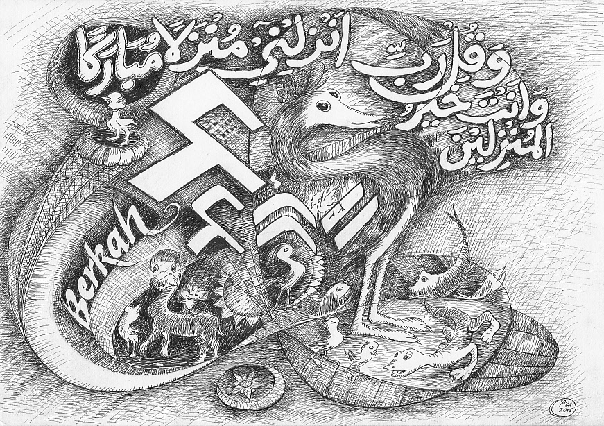 Dibuat di Makassar Sulsel, 12 September 2015/ 28 Zulqaidah 1436 H. Ukuran 21 x 29,7 cm. Media: Tinta Cina di atas kertas. Koleksi: Pribadi.