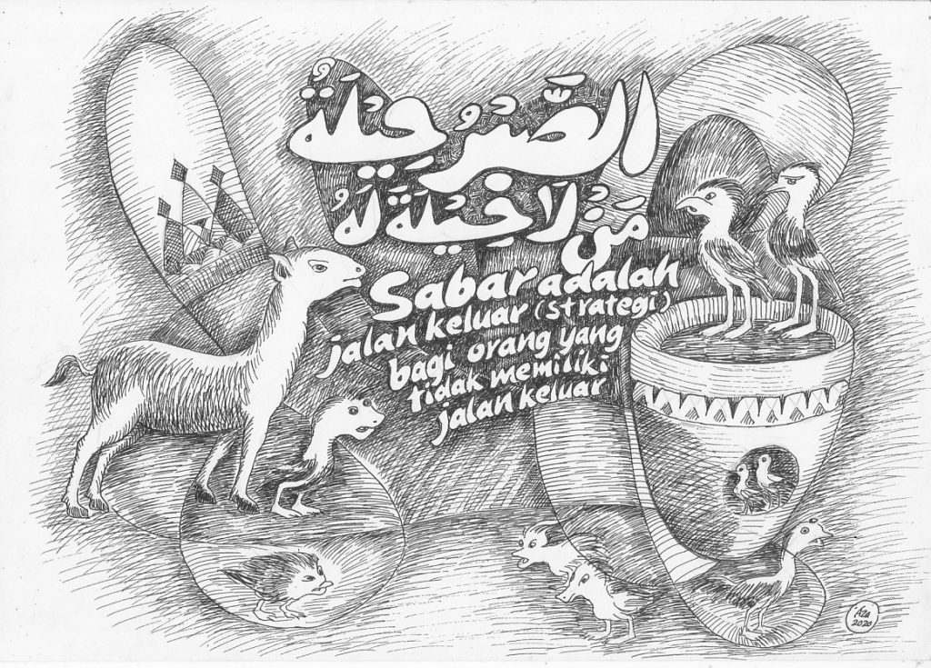 Dibuat di Makassar, tanggal 15 Maret 2020/ 20 Rajab 1441 H. Ukuran: 21 x 29,7 cm. Media: Tinta Cina di atas kertas. Koleksi: Pribadi.